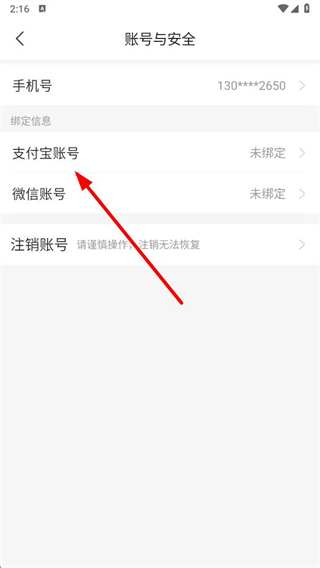 4、在账号安全页面点击支付宝账号选项,按照提示完成支付宝账号绑定即可。