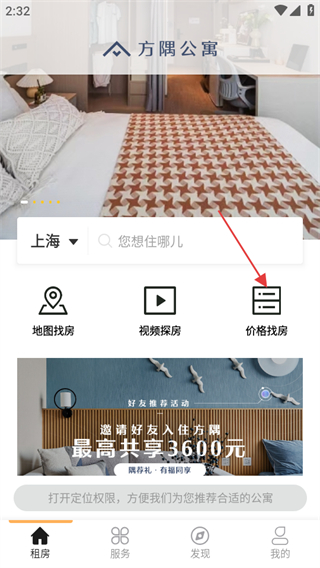 1、打开方隅公寓,点击价格找房,可进入价格找房板块。