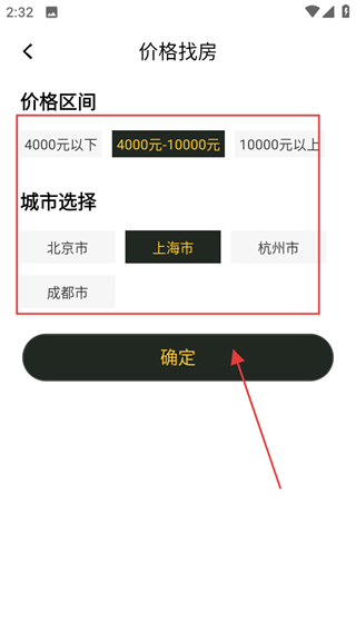 2、在价格找房板块,选择价格区间和城市后点击确定,可筛选出符合条件的房源。