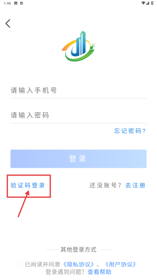 3、在登录方式选择界面,选择验证码登录,进入验证码登录页面。