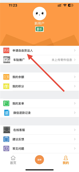 2、在个人页面点击申请自由货运人选项,进入申请页面。