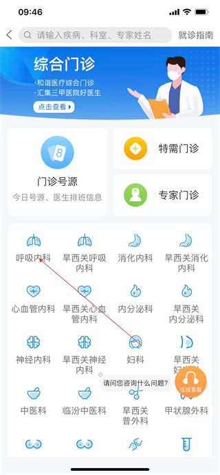 2、进入挂号页面后,选择对应的科室,例如呼吸内科。