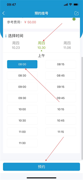 5、选择挂号时间,点击预约,完成挂号预约操作。