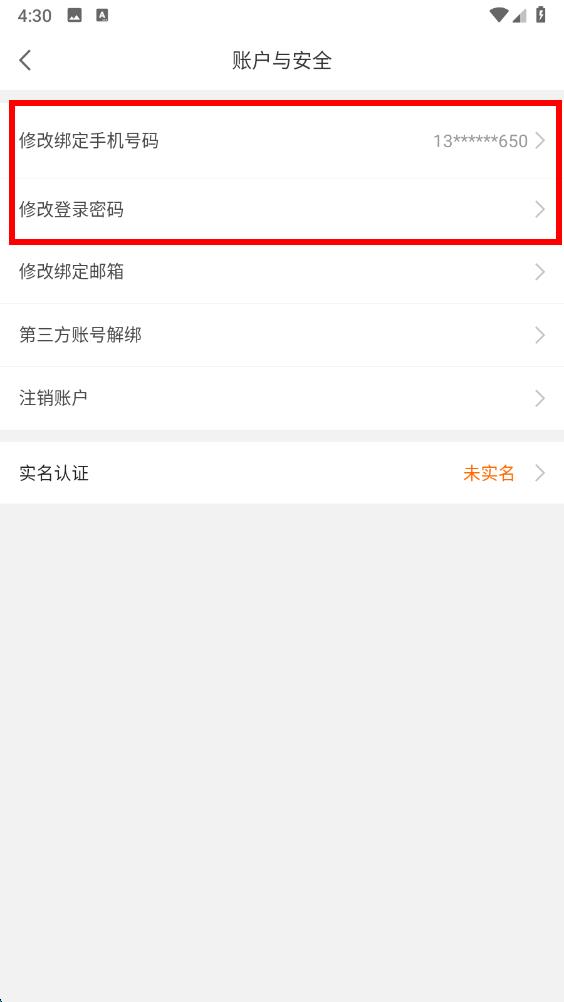 4、在账户与安全设置界面,点击修改绑定手机号码可按提示修改手机号,点击修改登录密码,根据后续提示完成密码修改操作。