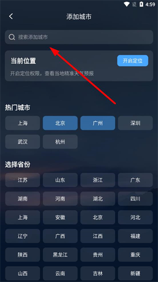 3、在添加城市页面的搜索框中输入想要添加的城市名称,或在热门城市、省份列表中选择城市。