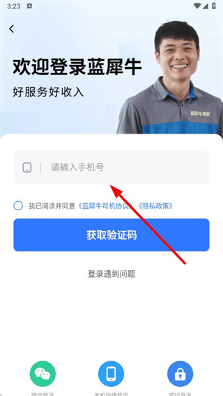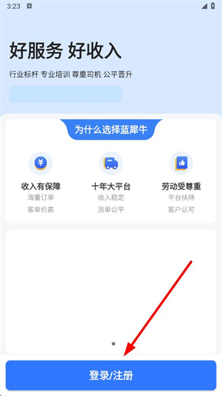 1、在蓝犀牛司机端app界面点击登录注册按钮,进入登录注册页面。