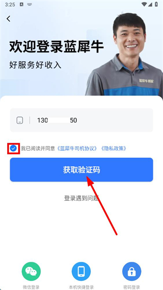 3、输入收到的验证码,即可完成蓝犀牛司机端的注册流程。