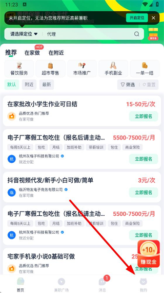 1、打开青团社兼职APP进入首页,点击首页底部右下角我的按钮。
