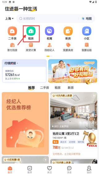 1、打开房产租赁应用,点击首页租房选项,进入租房页面。