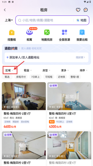 2、在租房页面,点击区域筛选条件,进入区域筛选界面。