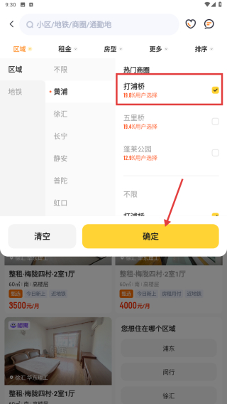 3、在区域筛选界面,找到打浦桥商圈并点击确定,完成区域筛选。
