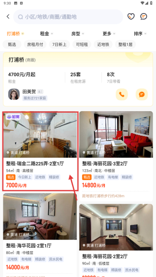 4、筛选完成后,即可查看打浦桥商圈下的租房房源列表,如整租·瑞金二路225弄2室1厅等房源信息。