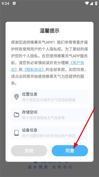 1、在温馨提示弹窗中,点击同意,进入APP首页。