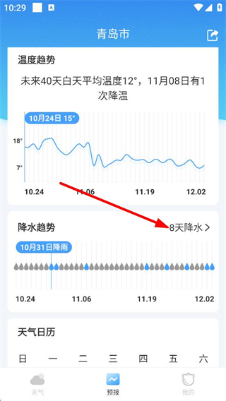 3、在预报页面,点击8天降水,进入降水日期列表页面。