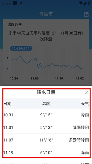 4、在降水日期列表页面,即可查看未来降水日期、温度及天气情况。