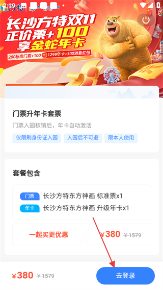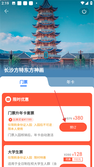 2、在门票预订页面,点击心仪门票套餐可进入套餐详情页面。