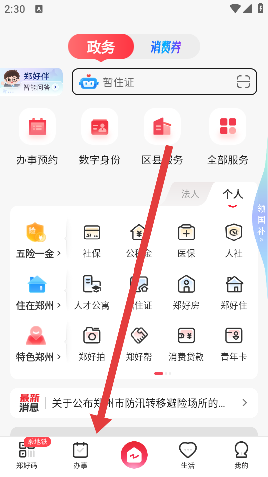 1、打开郑好办app最新版,点击底部导航栏办事图标,进入政务办事专属页面,可查看各类业务入口。