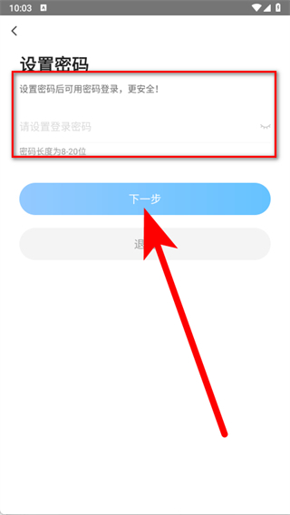 4、进入登录后,设置登录密码,点击下一步,完成注册。