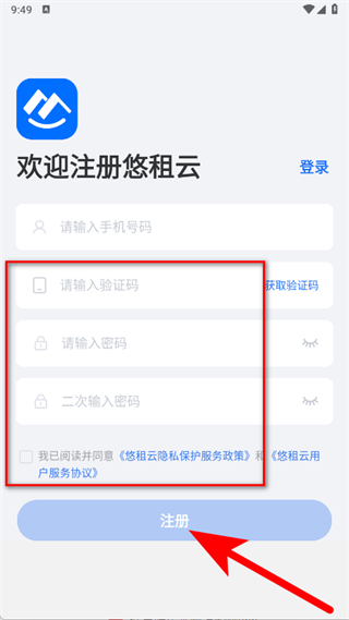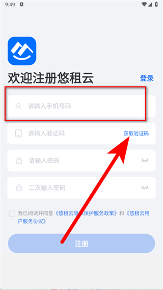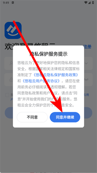 1、打开悠租云,在弹出的提示弹窗中,点击同意并继续,进入登录注册界面。
