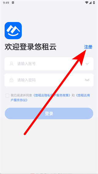 2、在登录注册界面,点击右上角注册选项,进入悠租云注册页面。