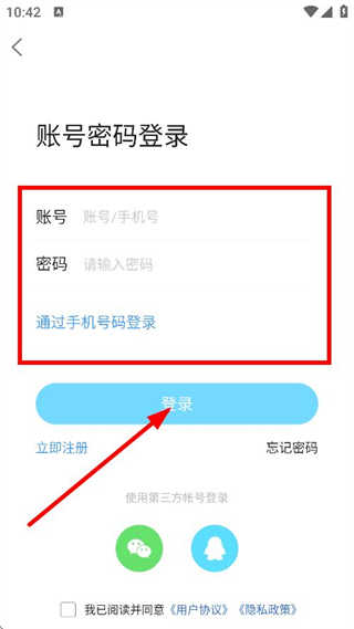 4、在账号密码登录页面,输入账号、密码,点击登录,完成账号登录。