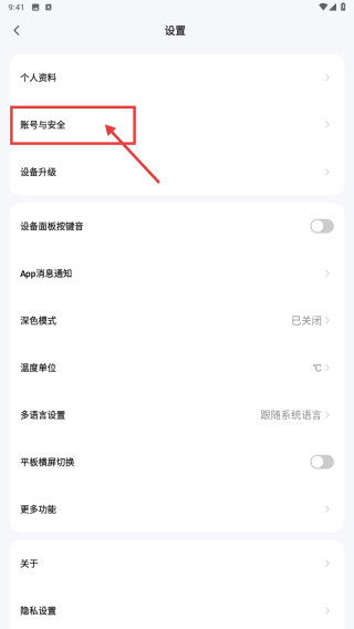 3、在设置页面,点击账号与安全选项,进入账号安全页面。