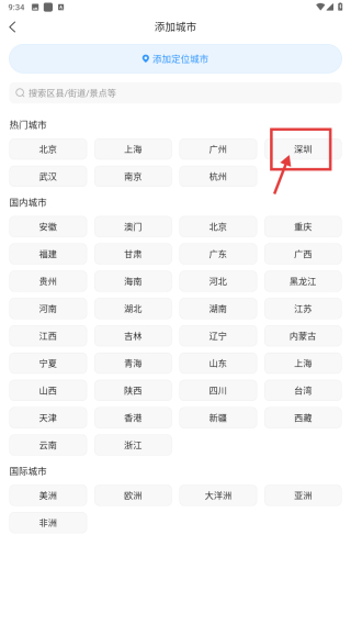 3、在添加城市页面,点击深圳选项,完成城市添加操作。