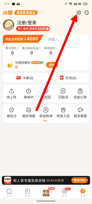 1、打开小蚕霸王餐,点击底部导航栏的我的,进入个人中心页面。