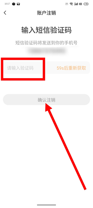 5、在输入短信验证码页面,输入收到的验证码后,点击确认注销,完成账户注销。