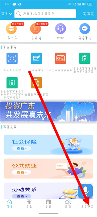 1、打开广东人社,点击底部导航栏的个人中心,进入个人中心页面。