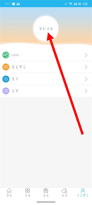 2、在个人中心页面,点击登录注册区域,进入登录注册界面。