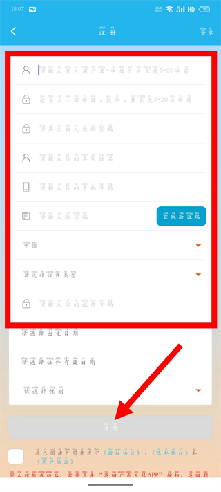 4、依次填写用户名、密码、手机号码等信息,勾选后,点击注册,完成账号注册。
