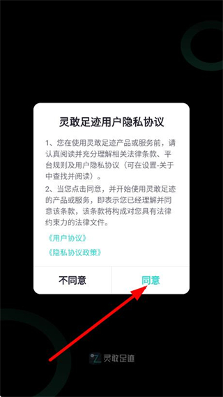 1、在灵敢足迹用户隐私协议弹窗中,点击同意,进入首页。