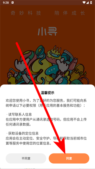 1、打开小寻,在温馨提示弹窗中点击同意,进入设备页面。