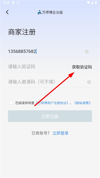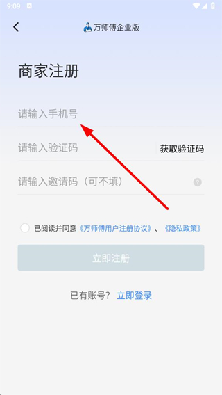 1、在万师傅app页面点击注册账号选项,进入商家注册页面。