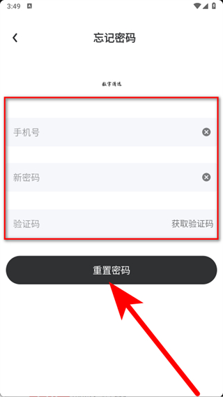 4、依次输入手机号、新密码,点击获取验证码并输入收到的验证码后,点击重置密码按钮,完成密码重置。