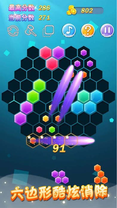 1、创新的六边形消除机制,玩家需要将六角方块巧妙排列成完整的一行或多行才能实现消除得分,这种独特的计分方式大大提升了游戏的策略性;