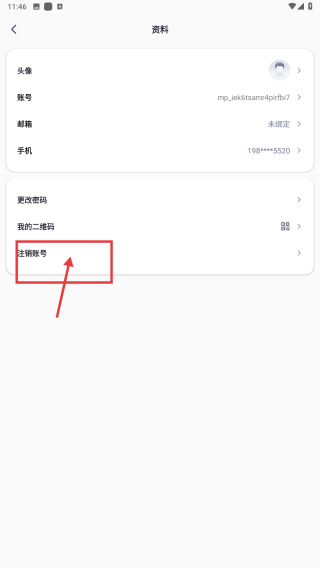 3、在资料页面,点击注销账号选项,进入注销账号页面。