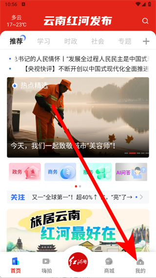 1、打开云南红河发布,点击底部导航栏我的,进入个人中心页面。