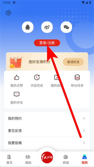 2、在个人中心页面,点击登录注册按钮,进入账号登录界面。
