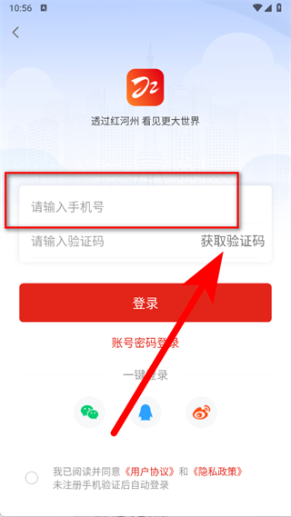 3、在登录界面,输入手机号,点击获取验证码。