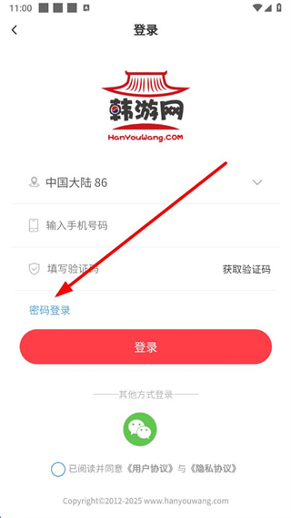 3、在登录页面点击密码登录选项,切换到密码登录界面。