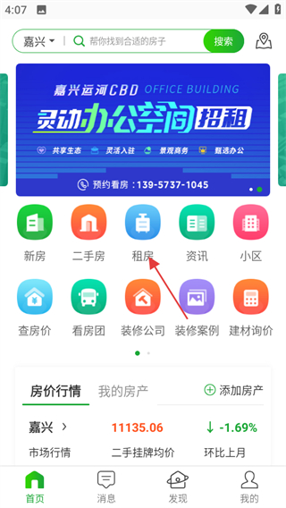 1、打开房产超市,点击租房选项,可进入嘉兴租房列表页面。