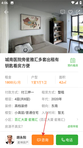 3、在房源详情页面,点击咨询可进入与房东的聊天页面。