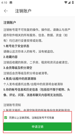 4、在注销账户说明页面,同意注销须知后点击申请注销可完成账户注销。