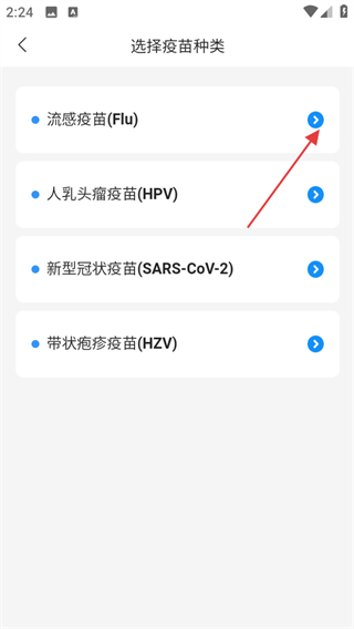 2、在选择疫苗种类页面,点击需要的疫苗如流感疫苗,可进入选择门诊页面。