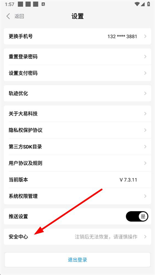3、在设置页面点击安全中心选项,弹出温馨提示框。