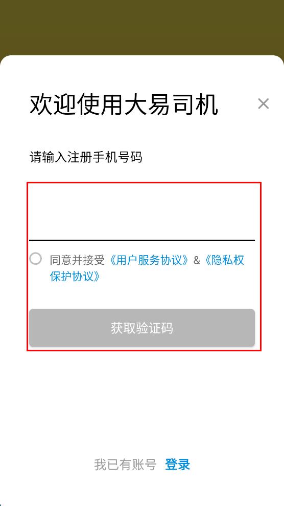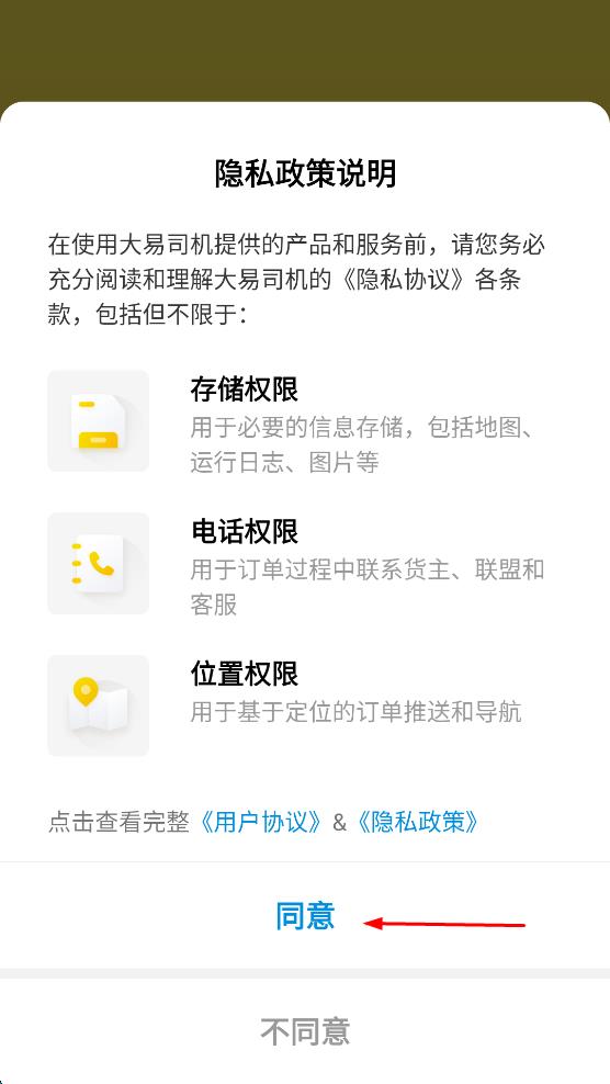 1、打开大易司机APP,在弹出的“隐私政策说明”提示框中,点击“同意”按钮,进入APP主界面。