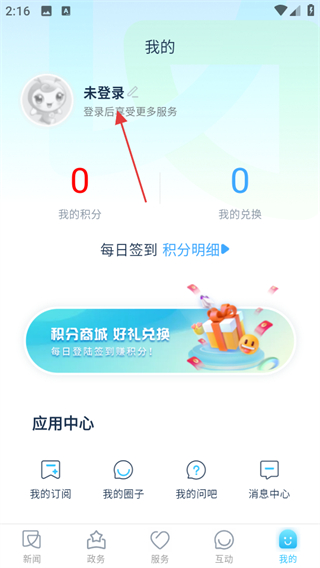 1、打开今日闵行,点击页面右下角我的,可进入个人中心页面。