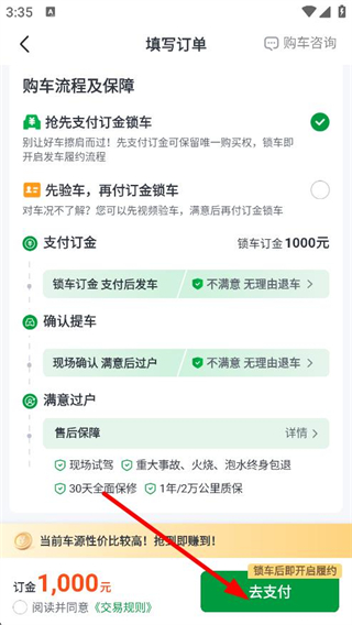 4、在填写订单页面,选择购车流程,点击去支付,完成订金支付,开启购车履约流程。